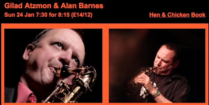 Happily it proved delightful, not least for the way in which Alan Barnes took the metaphorical centre stage, both musically and as the main ‘voice’ of the band: a surprise, given Atzmon’s well-earned reputations for grandstanding soloing and polemical humour in equal measure. This may have disappointed some for whom the showmanship is the (ex-)Israeli player’s appeal but it freed him up to play to the top of his game in the company of a player whom he clearly respected. The agenda was set out nicely by the first number, Barnes’ Fat Catwith the composer playing baritone sax against Atzmon’s alto. A perfect full-tilt unison bop opening elaborated into a grand solo blast-off that contrasted Barnes’ roots in the British sound of Tubby Hayes and Bobby Wellins with Atzmon’s more American allegiance to Charlie Parker and John Coltrane (though the spirit of the latter would run through both players at times). In Atzmonesque style the number subsided into a sleazy cabaret jazz playout that ended with smiles all round.