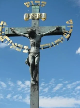 “In Prague’s Charles Bridge, the visitor will observe a great crucifix surrounded by huge gilded Hebrew letters that spell the traditional Hebrew sanctification Kadosh Kadosh Kadosh Adonai Tzvaot, “Holy, Holy, Holy is the Lord of Hosts.” According to various commentators, this piece, degrading to Jews, came about because in 1609 a Jew was accused of desecrating the crucifix. The Jewish community was forced to pay for putting up the Hebrew words in gold letters. Another explanation is that a Jew spat at the cross and for this he was to be put to death as a punishment. When this man begged for his life, the king, seeking to have good relations with the Jews, said the Jewish community had to rectify the offence….” (To read more: Travel Guide for Jewish Europe, pg 497)
