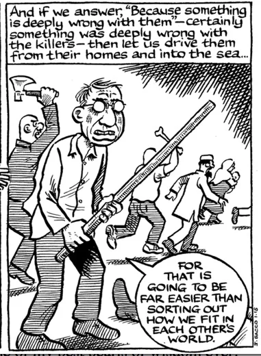Guardian cartoonist Joe Sacco expresses this form of moral awakening very well. As opposed to the Jerusalemite Aaronovitch, the Athenian Sacco ends his post-Charlie Hebdo massacre comic strip with a desperate call for reconciliation. Let us at least try to fit into each other’s world, Sacco suggests.