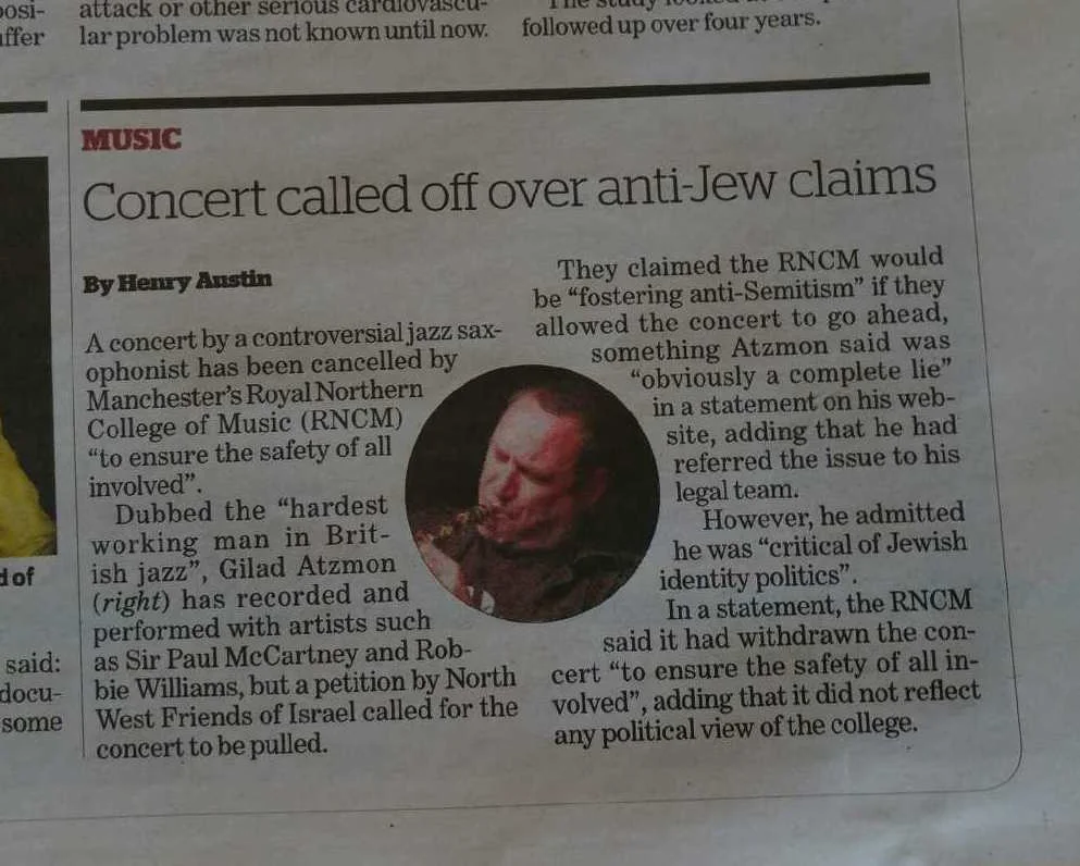It doesn't take a genius to notice that British media shows a real fatigue of Zionist's violence in our midst. This Manchester concert cancellation saga has brought a lot of attention to the vile tactics Jewish militant organizations are employing in our midst. For the first time, I detect a clear mainstream acceptance and support of my views and thoughts. If British Jews are concerned with antisemitism, and they should be, they better find a way to restrain their extremist Zionist elements.