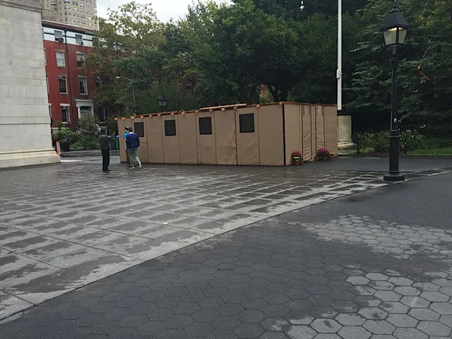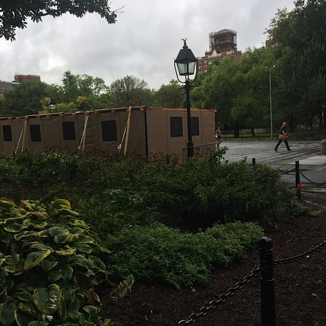 This week it also contains a sukkah. Although intended to celebrate the distant harvest (Washington Square Park has no edible greenery I know of), perhaps in honor of Israel’s recent conflicts, the sukkah most resembles army barracks.