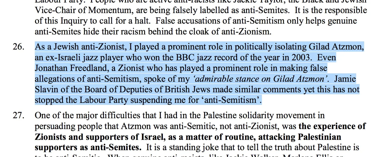 "Even Jonathan Freedland, a Zionist who has played a prominent role in making false allegations of anti-Semitism, spoke of my ‘admirable stance on Gilad Atzmon’. Jamie Slavin of the Board of Deputies of British Jews made similar comments yet this has not stopped the Labour Party suspending me for ‘anti-Semitism’."