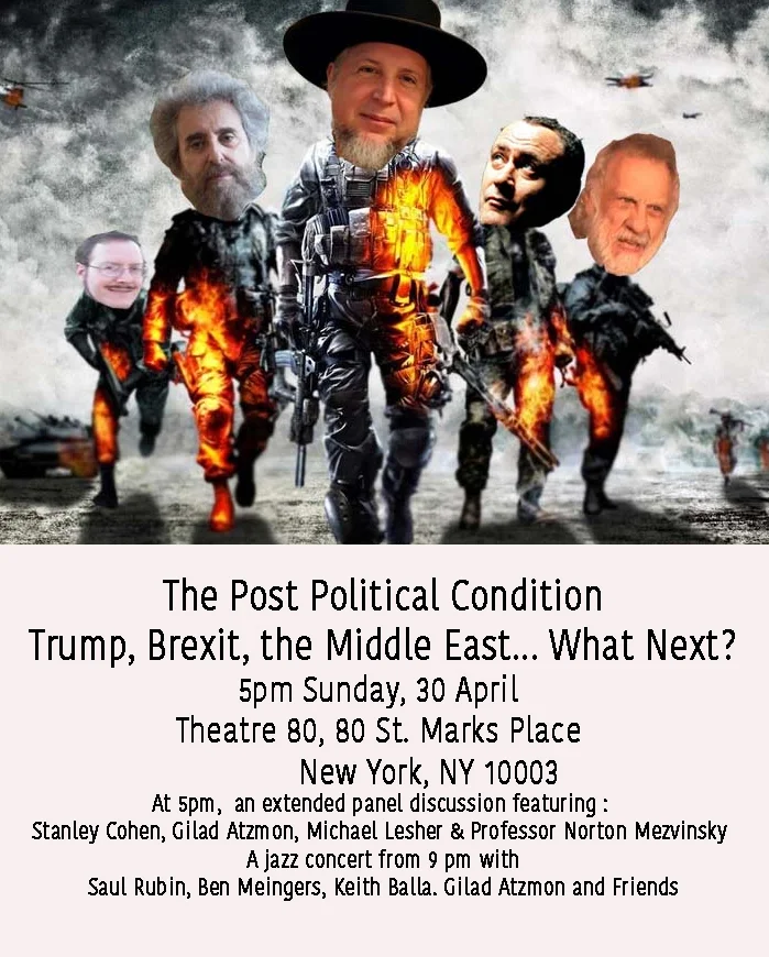 On 30 April human rights lawyer Stanley Cohen, history professor Norton Mezvinsky, whistleblower Michael Lesher and author Gilad Atzmon will gather in Theatre 80, Manhattan to elaborate on the collapse of Identity politics, the crisis within new Left thinking and the future of liberal and progressive thought.