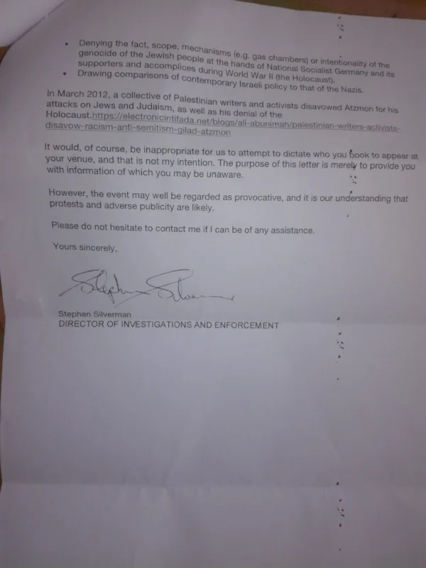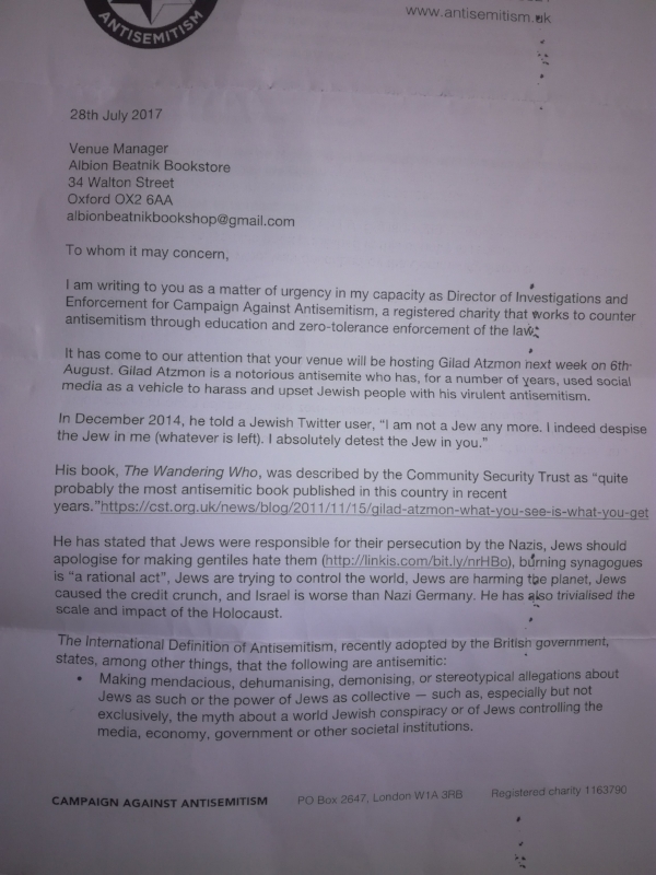 Earlier today, a book shop in Oxford that regularly hosts my concerts posted the attached letter (see below) to my Facebook page. The Oxford venue received the letter from the ultra-Zionist Campaign Against Antisemitsm (CAA). The CAA letter is blatantly and intentionally defamatory and duplicitous.
